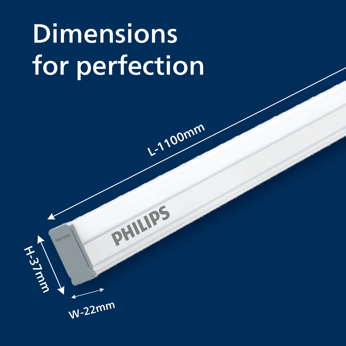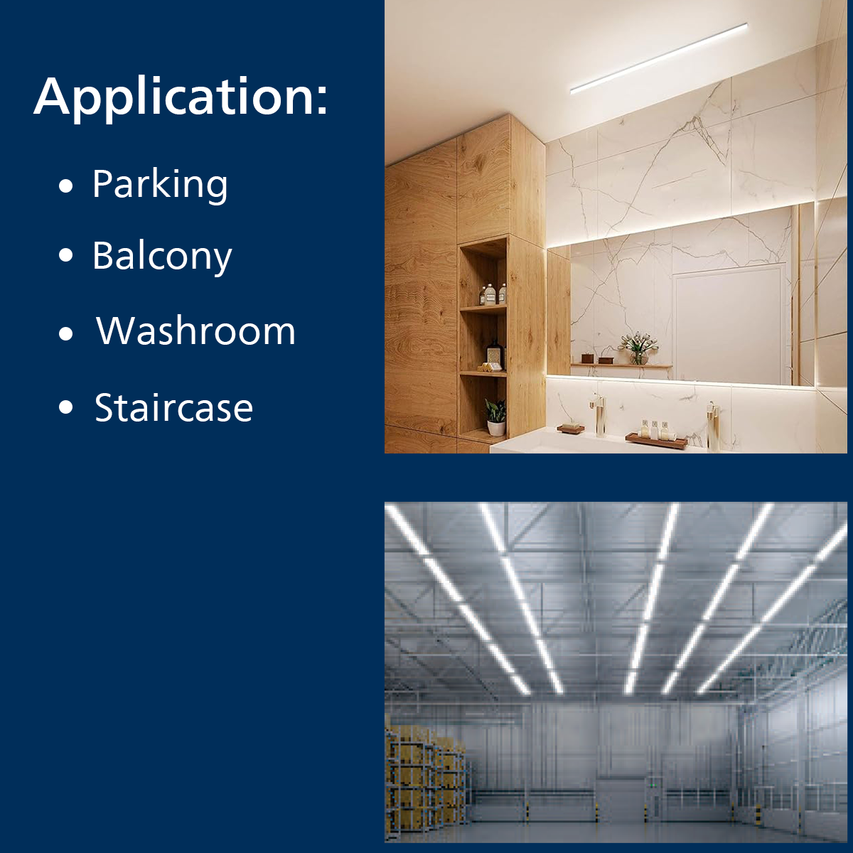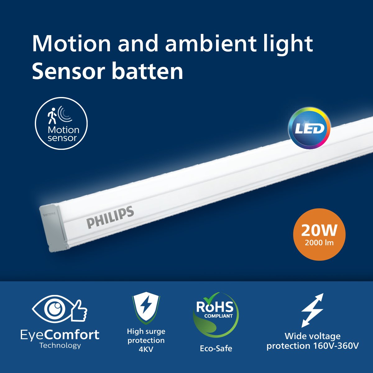 The Philips Motion Sensor LED Batten is an intelligent lighting solution that detects motion within a 5-meter radius. Ideal for low-traffic areas, it dims after 2 minutes of no activity and turns off after another 2, ensuring energy savings and convenience without compromising brightness or safety.